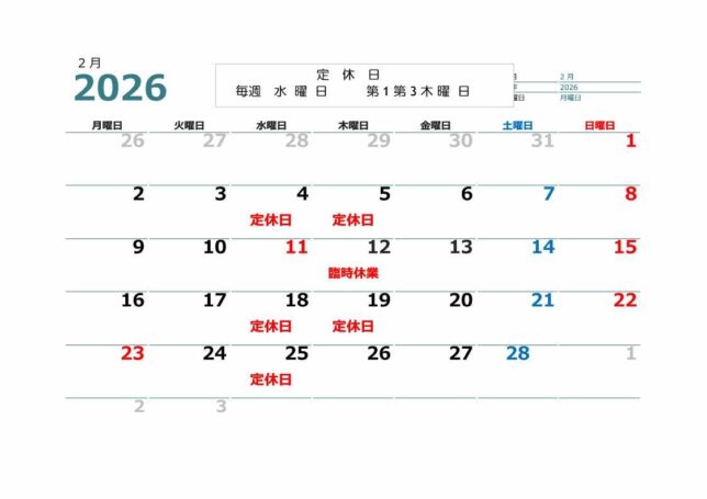 2026.2月の営業日のお知らせ