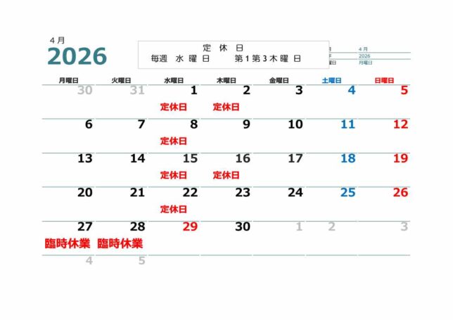 いつもご利用ありがとうございます。4月の営業日をお知らせいたします。